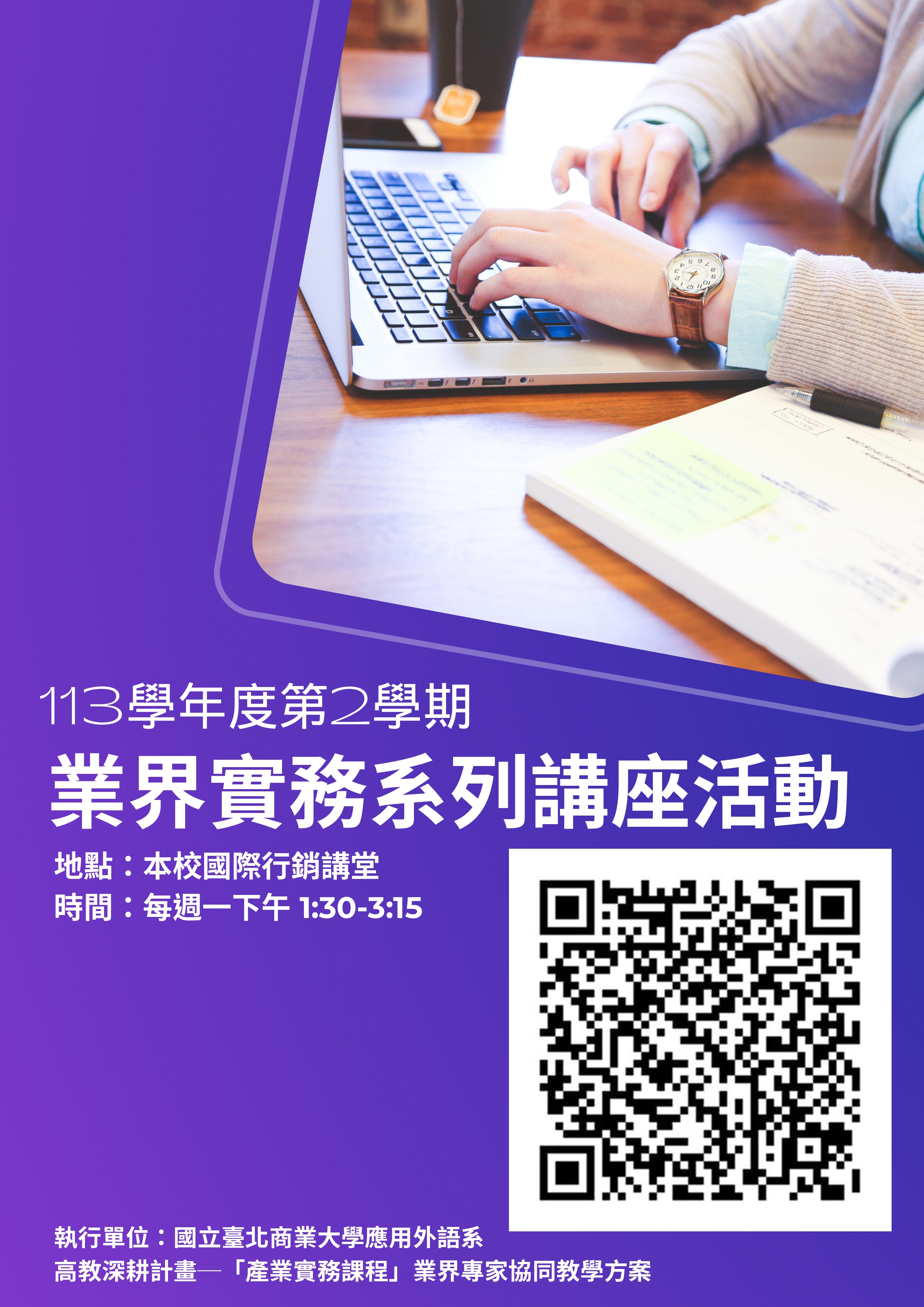 國立臺北商業大學應用外語系訂於113學年度第2學期舉辦「業界實務系列講座」活動,期藉業界專家的實務經驗分享與互動交流,幫助全國學生掌握最新相關產業發展與就業趨勢。