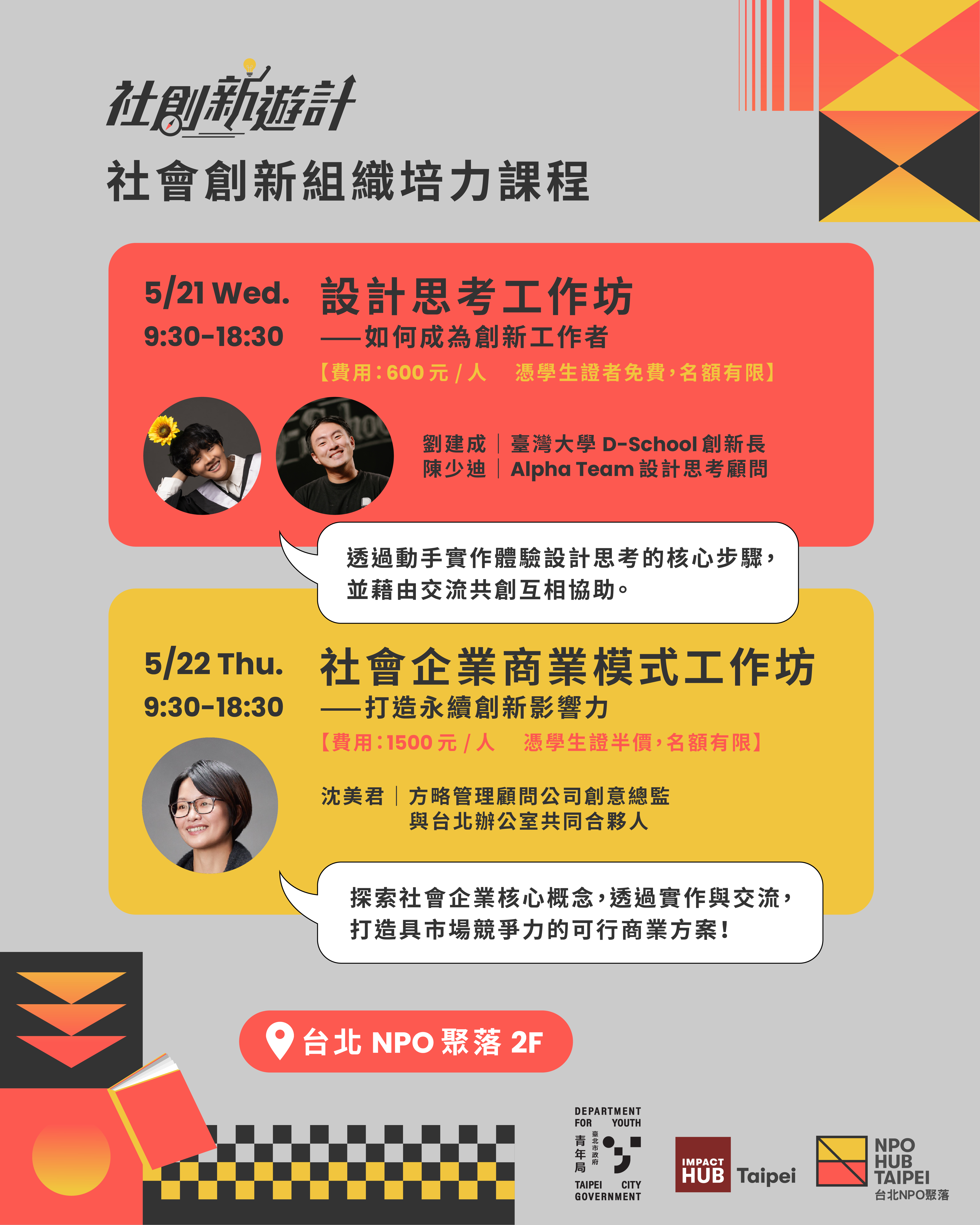 社會創新組織培力課程-社會企業商業模式工作坊—打造永續創新影響力報名:https://www.accupass.com/go/NPO0522