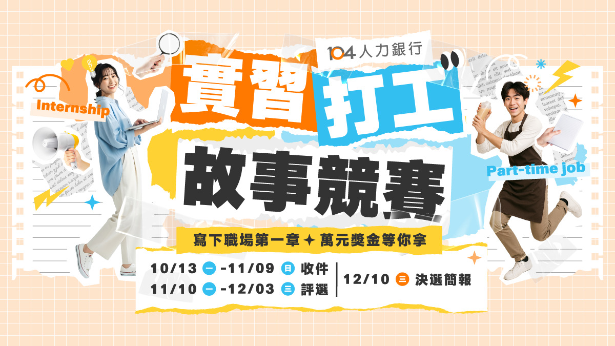 一、活動目的:為協助大專校院學生以實際經驗深化職涯探索,104人力銀行舉辦《實習打工故事競賽》。