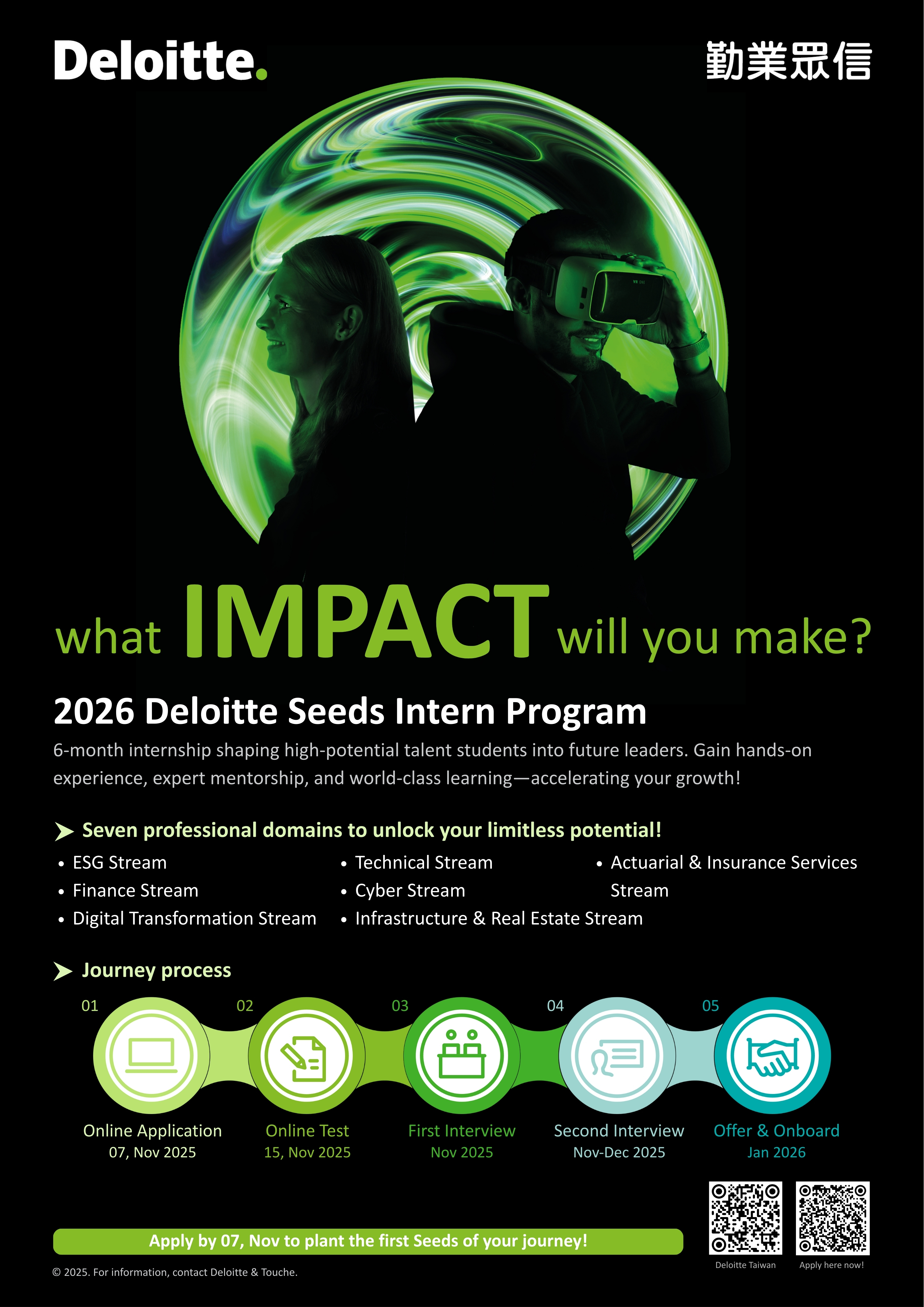 2026 Deloitte Seeds Intern Program是顧問業務服務(Deloitte Consulting Businesses)為期6個月的實習計畫,你將獲得專業顧問作為你的mentor,帶領你累積寶貴的實務經驗,同時接受專業技能訓練,另外還有多元的交流活動拓展人脈與視野,讓實習生能夠親身體驗顧問工作的日常,並透過參與商業課題與專案實戰的過程,將創意化為實際影響力。歡迎來自會計與財務、企業管理、資訊工程、資訊管理、環境科學、社會科學等相關領域的同學加入。
